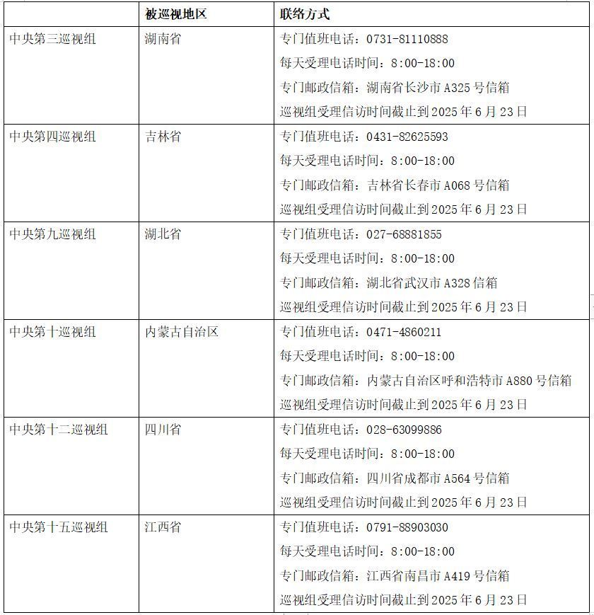 已进驻中央巡视组联络方式: