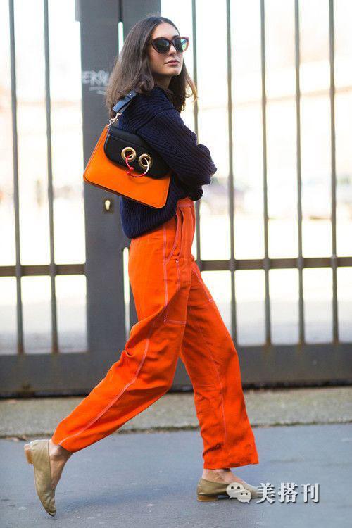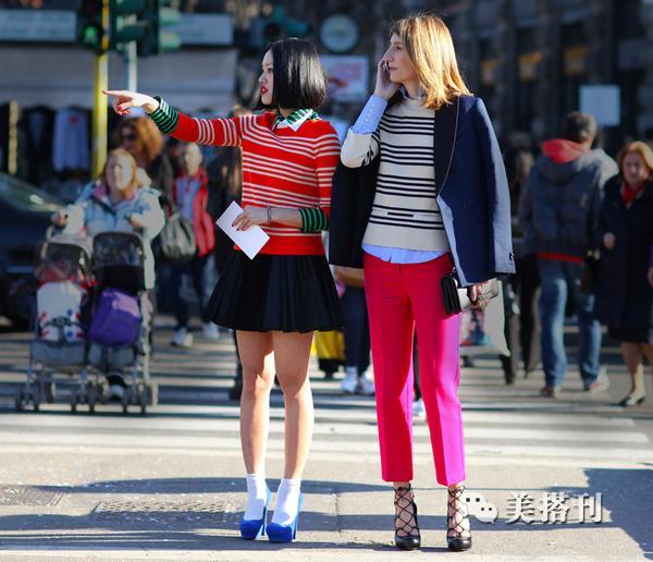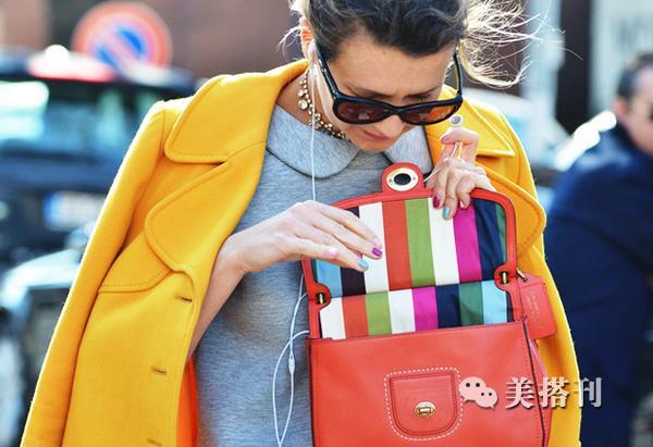 服饰搭配中加入条纹的撞色包包做点缀也是巧妙的搭配,平日搭配中可以加入包包、丝巾、彩虹袜子这些撞色单品,利用小面积的撞色比例也能让全身焕发与众不同的美感。