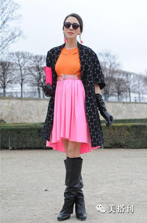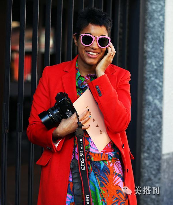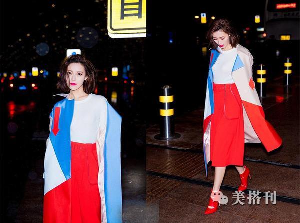 大红色的外套搭配撞色的连衣裙,色彩混搭也能碰撞出明亮气质的潮搭。