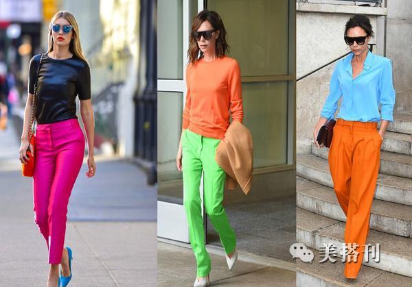 贝嫂是最爱穿撞色搭配的,她经常会搭配撞色长款和上衣对撞的搭配。橘色上衣搭配了荧光绿的裤子,上下款式的撞色,可以选择色彩明度和谐,红黑、粉蓝、红蓝都是不错的选择。