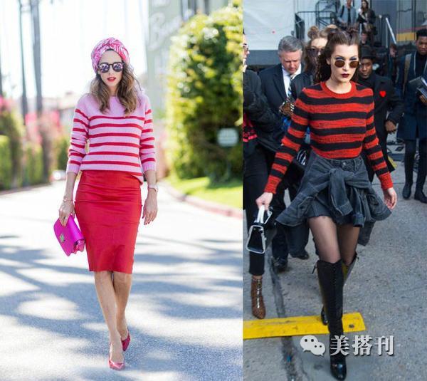 红白和黑白条纹的撞色是最百搭的搭配,色彩比较鲜艳的色彩加入中性色调的色彩,视觉上会更显柔和,不会给人过于扎眼的排斥感。