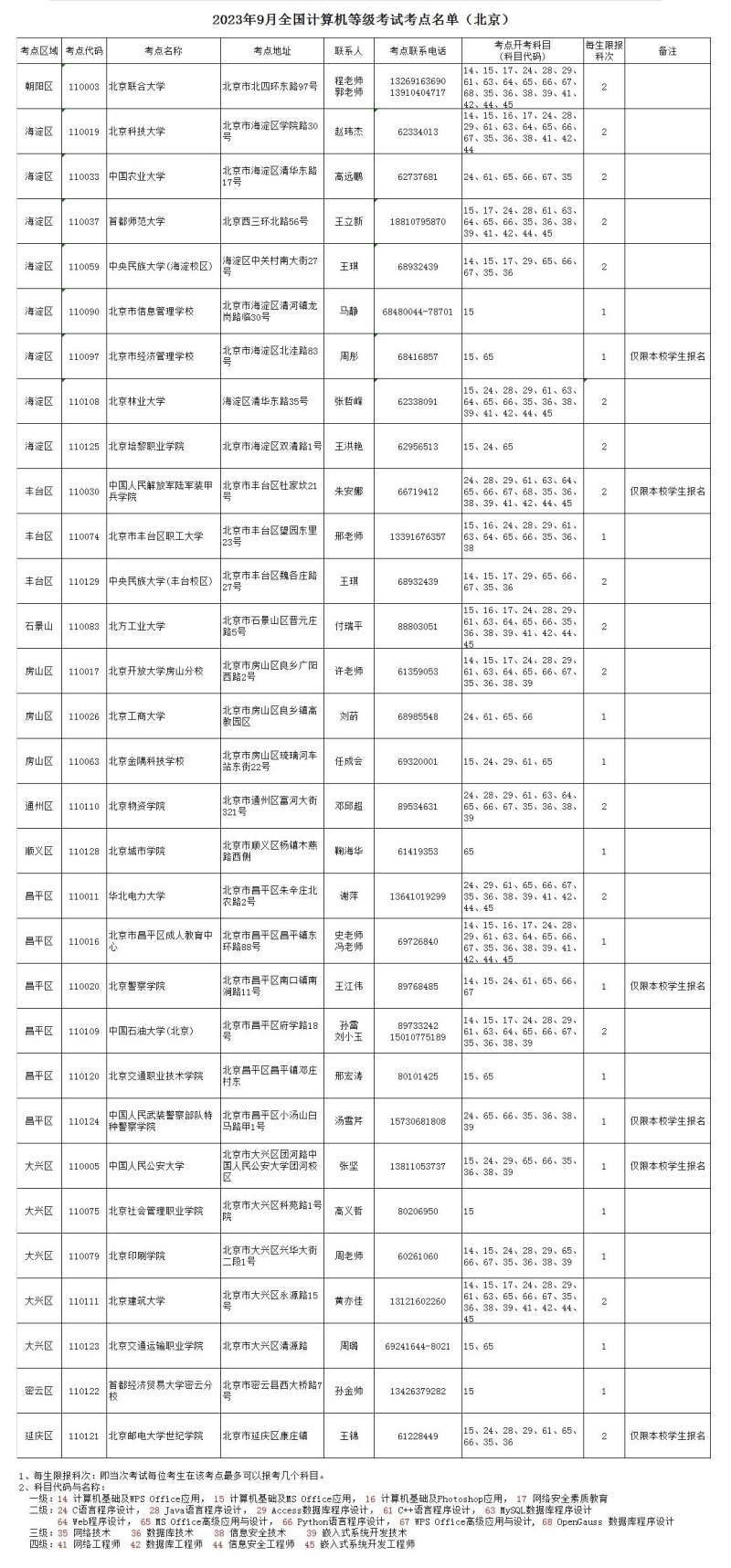 附:2023年9月NCRE考点名单(北京)