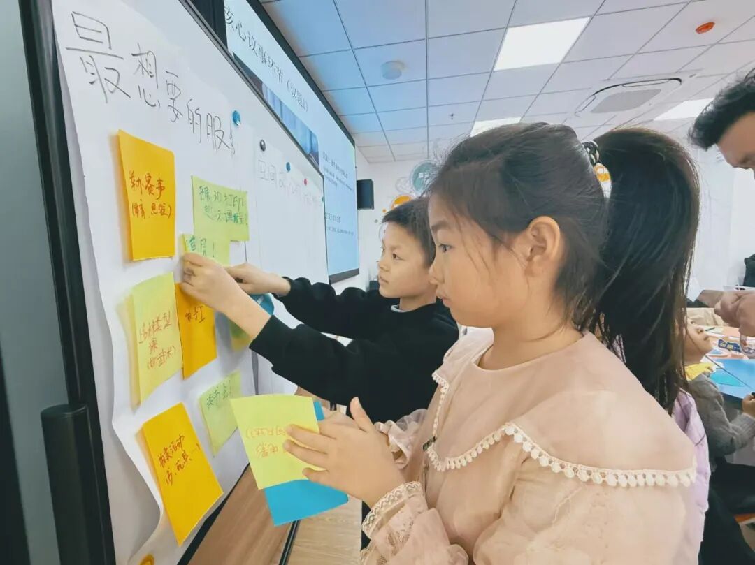 “我会画画,可以教其他小朋友!”“我擅长跳舞,可以带大家活动!”在“我能参与的服务”分享环节,青少年们手持绿色便利贴,踊跃展示自身特长与兴趣。随后的分组讨论中,大家围绕“希望获得的支持”“能为会客厅做什么”等问题各抒己见,思维的火花不断碰撞。小组代表的精彩分享,不仅展现了孩子们的创造力与责任感,更赢得了现场阵阵掌声。现场的点赞贴纸投票环节,进一步锁定了“最想要的服务”和“最想参与的服务”,为未来会客厅的精准服务升级指明了方向。