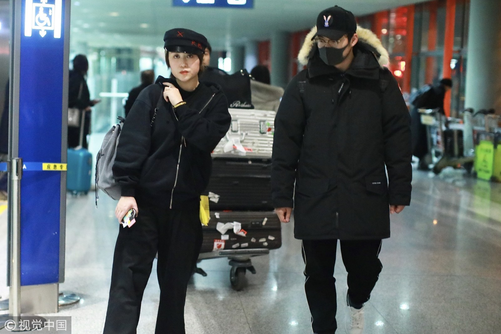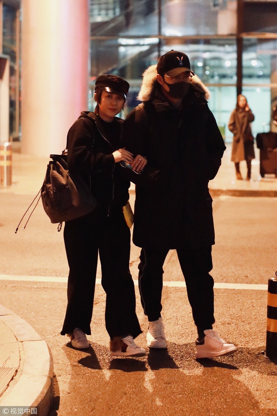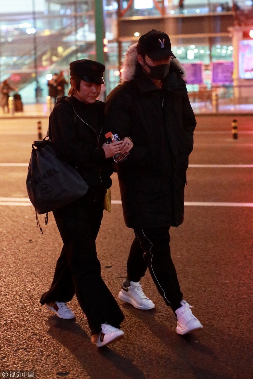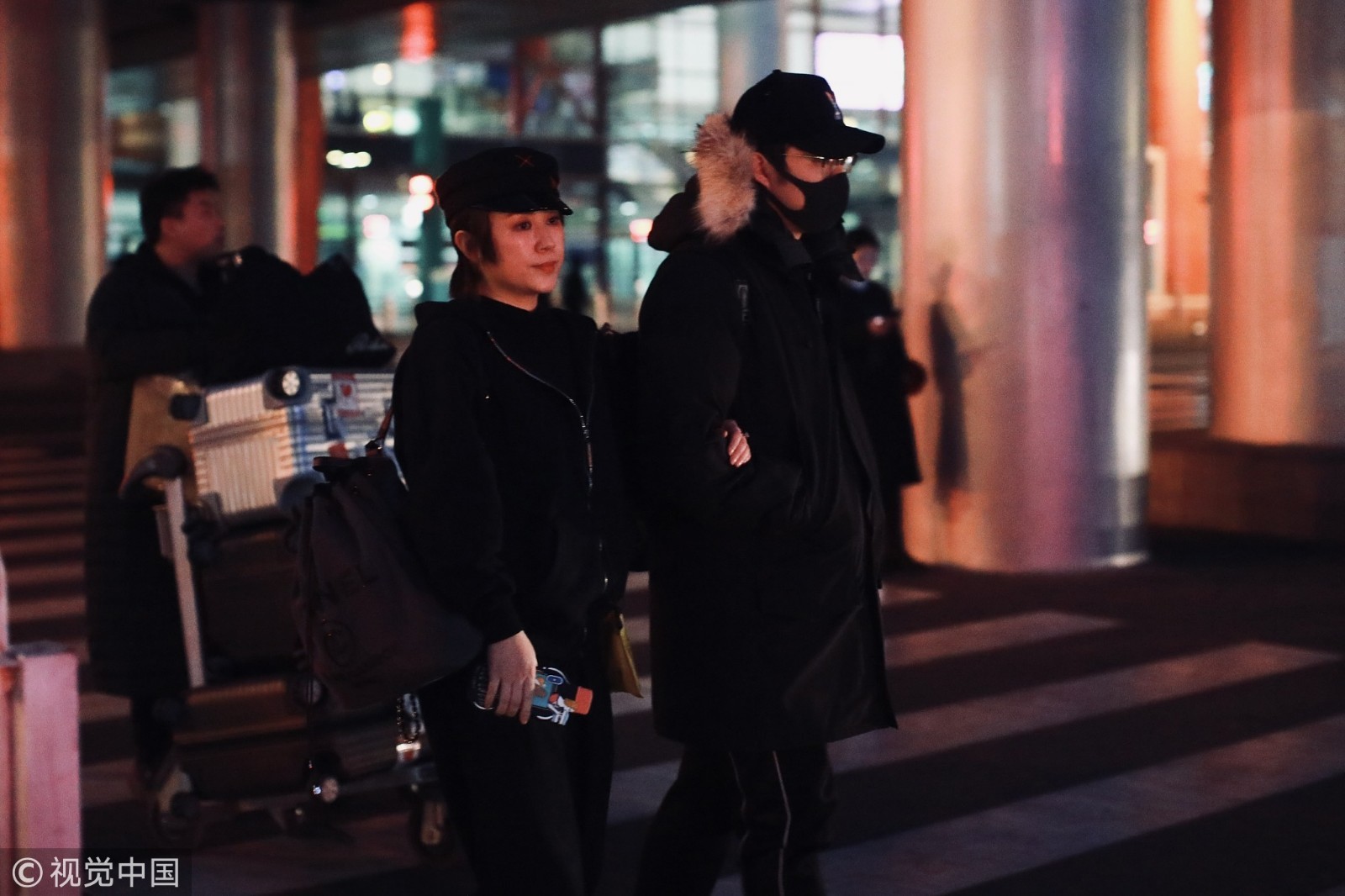 两人穿情侣黑装深夜抵京超低调,马丽挽手老公小鸟依人,老公包裹严实紧跟护驾恩爱十足。