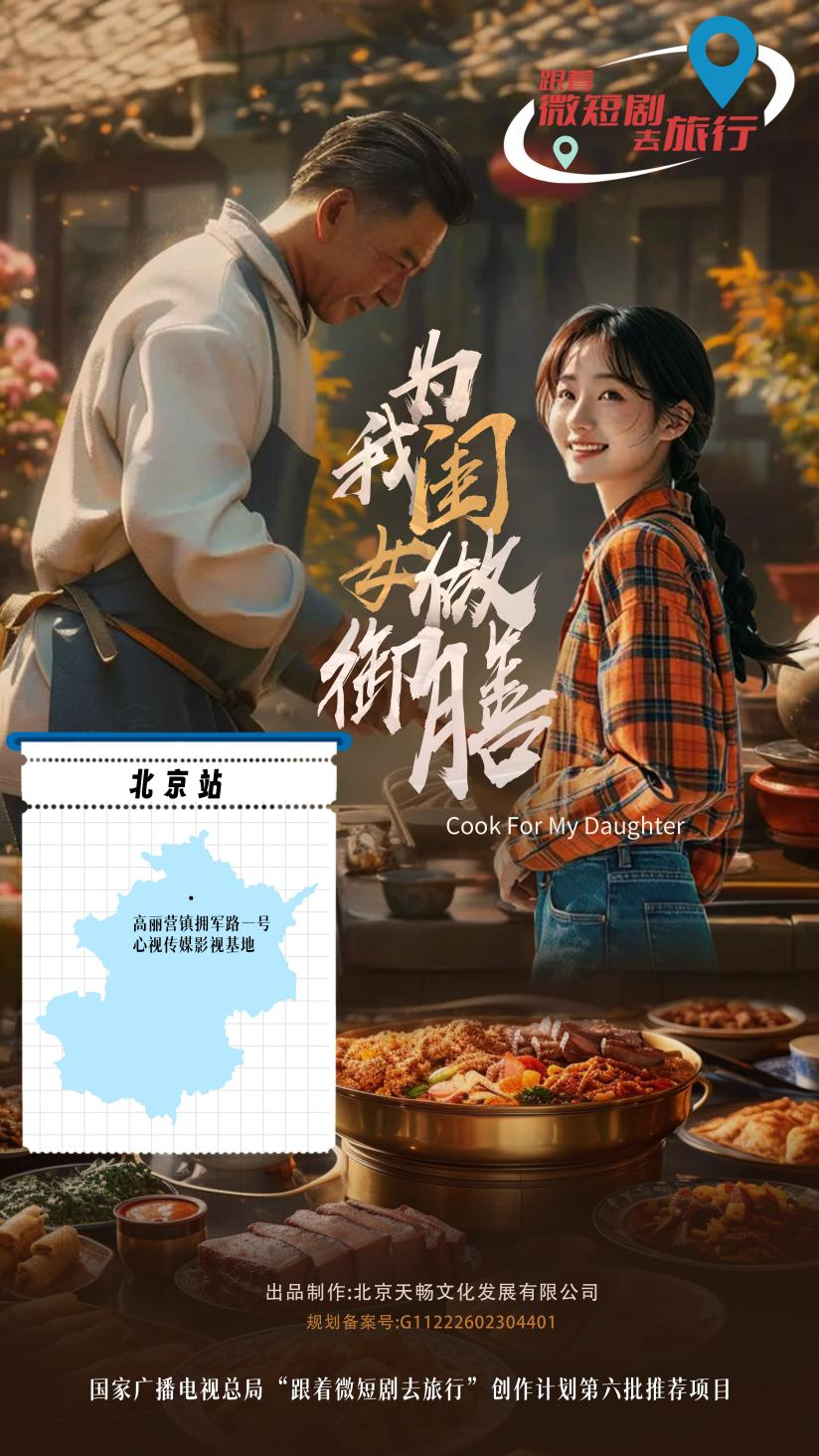 《为我闺女做御膳》由北京天畅文化发展有限公司出品并制作,共15集,每集10分钟。取景地为北京顺义区高丽营镇拥军路一号心视传媒影视基地,讲述了老马为了缓和与女儿的矛盾,重拾御膳绝学在除夕夜为女儿做出一桌丰盛的除夕家宴实现人生逆袭的故事,展现了北京地域文旅的特色和原汁原味的御膳美食文化。