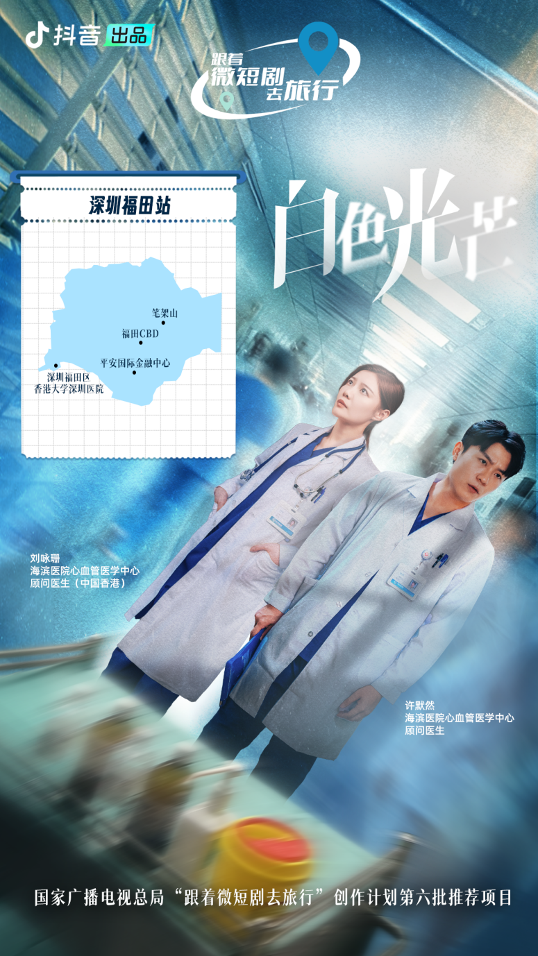 《白色光芒》由抖音出品,中广天择传媒股份有限公司制作,共12集,每集5分钟。取景地为深圳福田区香港大学深圳医院、福田CBD、平安国际金融中心、笔架山等,讲述来自广东的外科医生许默然与来自香港的医生刘咏珊经过一系列医疗事件,从竞争对手变成完美搭档的故事,为深港合作及粤港澳大湾区发展的重要时代提供了鲜活注脚。