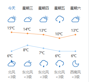 今天早晨南部地区和山区有轻雾,白天晴转多云,北转南风二三级,最高气温15℃;