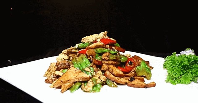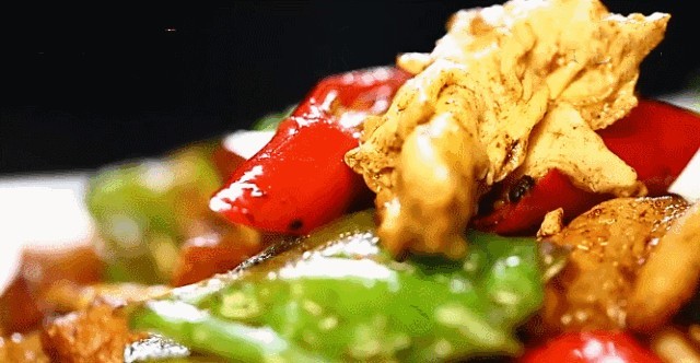 7、不加底油,直接下五花肉煸炒出油脂,下入葱姜、豆干煸香,加入半勺糖、鸡精、一点点胡椒粉调味,再下入红椒、苦瓜大火翻炒。加入辣椒既可以开胃,又能祛湿!