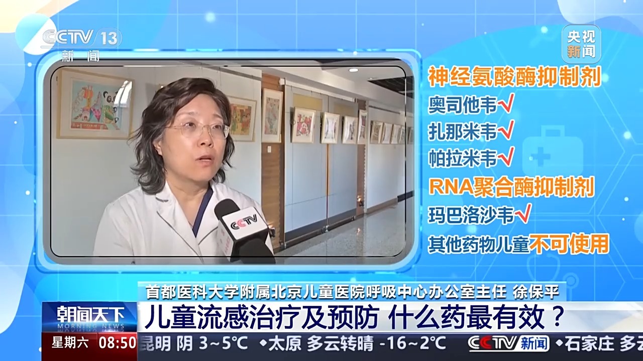 首都医科大学附属北京儿童医院呼吸中心办公室主任 徐保平:神经氨酸酶抑制剂,奥司他韦、扎那米韦和帕拉米韦,另外就是RNA聚合酶抑制剂,玛巴洛沙韦,其他的药物儿童都不能使用。