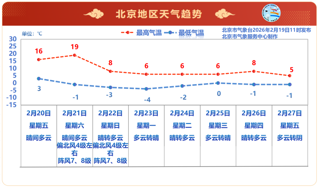 预计21日,冷空气影响京城,下午会带来4级左右偏北风,阵风可达7、8级,并伴有沙尘天气,北风扰动之下,最高气温可达19℃。