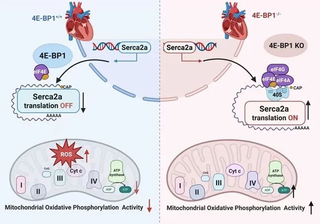 机制研究层面,团队明确了4E-BP1/2缺失可通过增强SERCA2a mRNA与eIF4G的结合效率,显著提升心肌组织中SERCA2a的蛋白翻译水平,而SERCA2a的表达上调是4E-BPs抑制发挥心脏保护作用的核心环节——当在4E-BP1/2双敲除小鼠中特异性敲低Serca2a后,其对心力衰竭的保护效应被完全逆转。此外,研究还证实4E-BP1是调控该过程的关键分子:心肌特异性敲低4E-BP1可复刻双敲除小鼠的心脏保护表型,而4E-BP1过表达则会加重心力衰竭的病理改变。