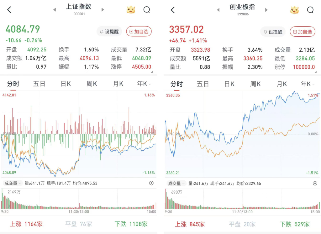 至收盘,上证综指跌0.26%,报4084.79点;科创50指数涨0.83%,报1384.99点;深证成指涨0.19%,报14307.58点;创业板指涨1.41%,报3357.02点。
