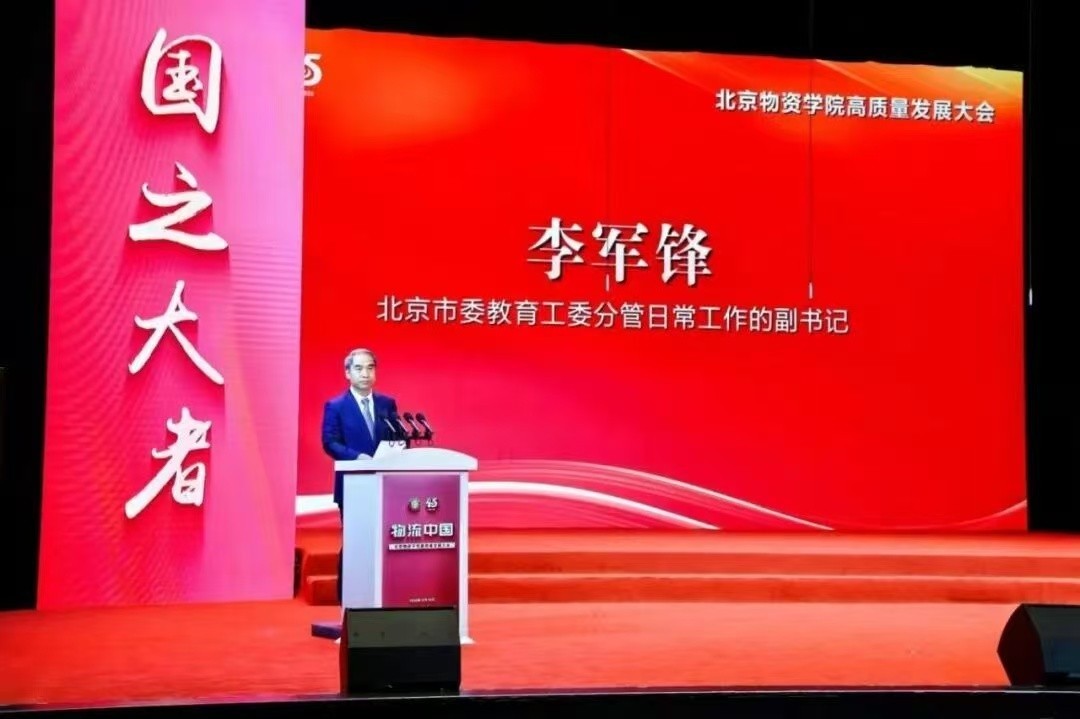 北京市委教育工委分管日常工作的副书记李军锋代表北京市教育两委,向北京物资学院表示热烈的祝贺。他指出,北京物资学院自1980年建校以来,始终与党和国家同向同行,与时代发展同题共答,与首都改革建设同频共振,在服务国家重大战略、支撑北京“四个中心”功能建设方面作出了重要贡献。李军锋强调,面向未来,学校要深入学习贯彻习近平总书记重要论述和指示批示精神,全面落实市委市政府部署要求,奋力推动各项事业高质量发展。一是立足新阶段,构建落实立德树人根本任务新格局,着力培养堪当民族复兴重任的时代新人。二是把握新要求,全面落实教育、科技、人才一体化推进要求,构建产学研协同融合的新生态。三是承担新使命,紧密对接新时代首都发展需求,在优化专业布局、加强科研攻关、提升社会服务等方面展现新作为,为谱写中国式现代化的北京篇章贡献物院智慧和力量。