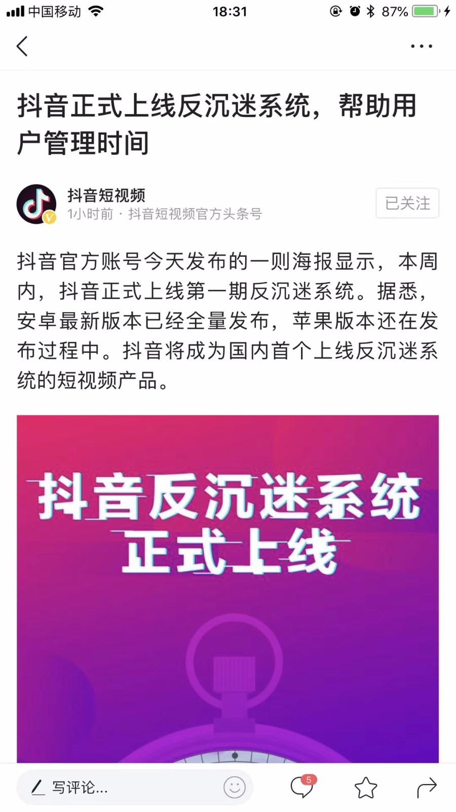 今日头条的反思第一步是“抖音”。今日下午,抖音官方将于本周内正式上线第一期反沉迷系统。据悉,安卓最新版本已经全量发布,苹果版本还在发布过程中。抖音将成为国内首个上线反沉迷系统的短视频产品。