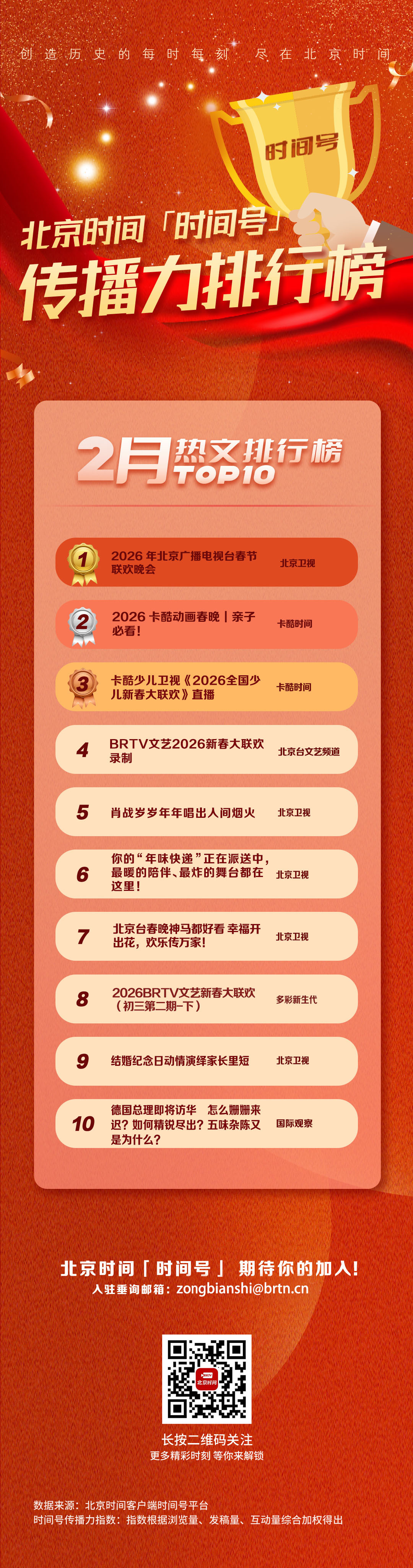 2026年2月,「北京时间」客户端继续拓展不同领域机构入驻时间号平台。哪些机构的成绩更亮眼?哪些文章的传播力更突出?2月榜单新鲜出炉,一起来看!