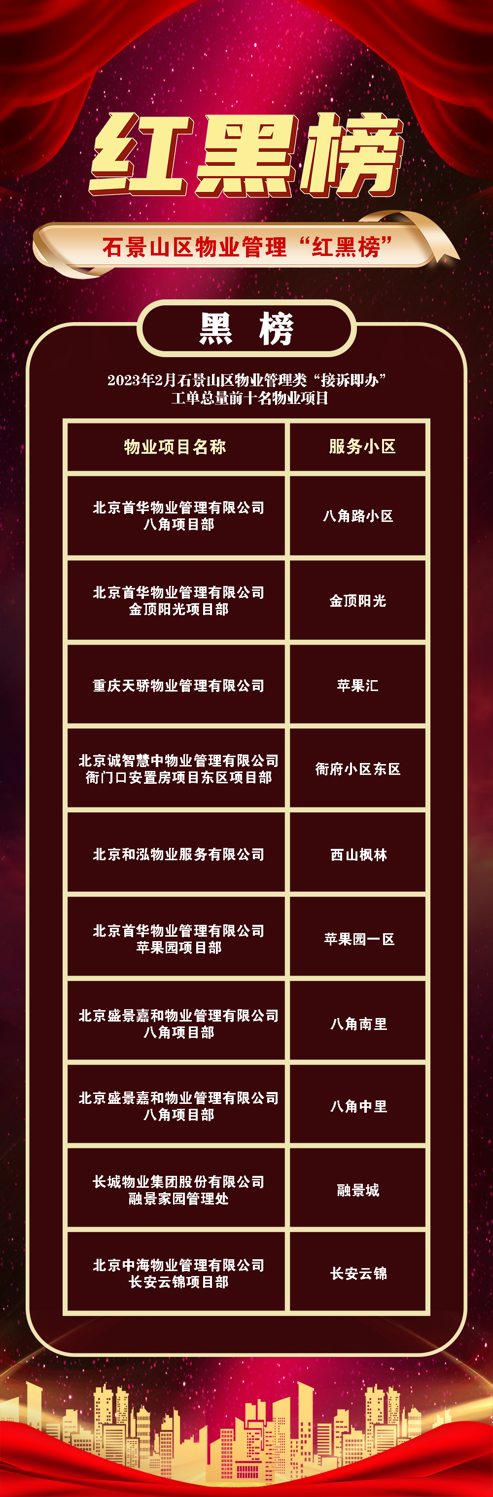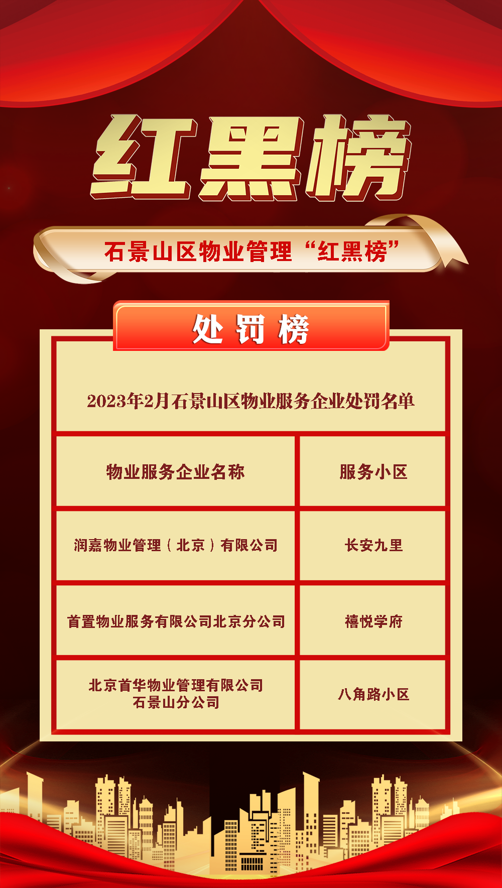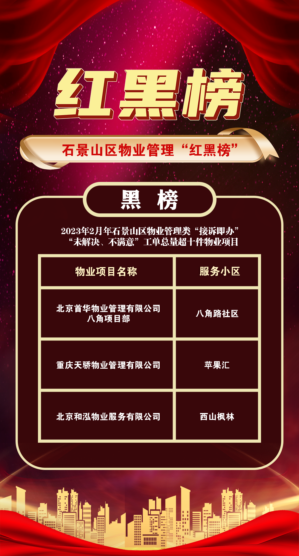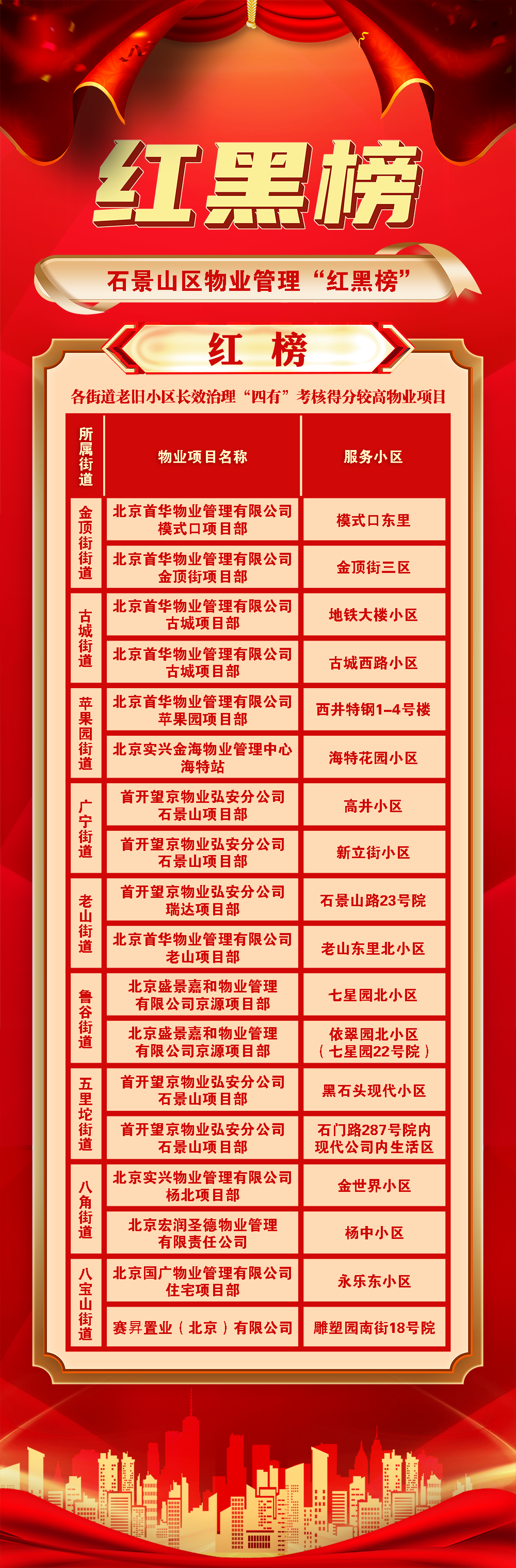 为进一步深化物业管理体制改革,规范石景山区物业服务企业服务行为,推动物业行业健康发展,区住建委进一步落实物业服务企业“红黑榜”机制,加强事中事后监管,接受群众监督,充分发挥优秀物业服务项目示范引领作用,激励先进、带动后进,推动石景山区物业服务管理水平提升,为小区居民提供更好的物业服务。(第一期红黑榜!戳→物业红黑榜来了!石景山持续推动物业服务质量提升)