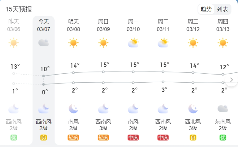 北京周末天气晴暖,白天适宜户外赏春,风力不大。早晚的最低温度仍然较低,出行还需要适当增加衣物,以免着凉感冒。