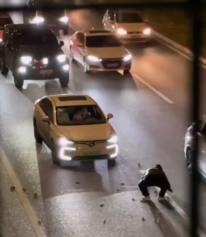 曹先生先是用脚踢开一部分异物,随后发现效率太低了,不如手捡,随后索性直接动手将异物一个个弯腰捡起来放到路边。在清理异物的同时,曹先生还不断挥手向过往车辆示意,让他们转移车道,这时一辆白色的小轿车没有转移车道,而是径直开到了曹先生身前,帮他挡住了车流。