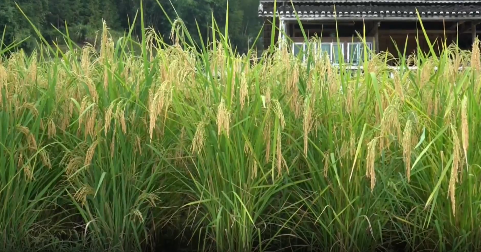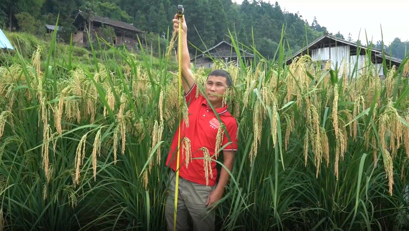 在贵州省榕江县寨蒿镇三洲村,走进成片金黄色的稻田。你会看到比人还高的巨型稻。