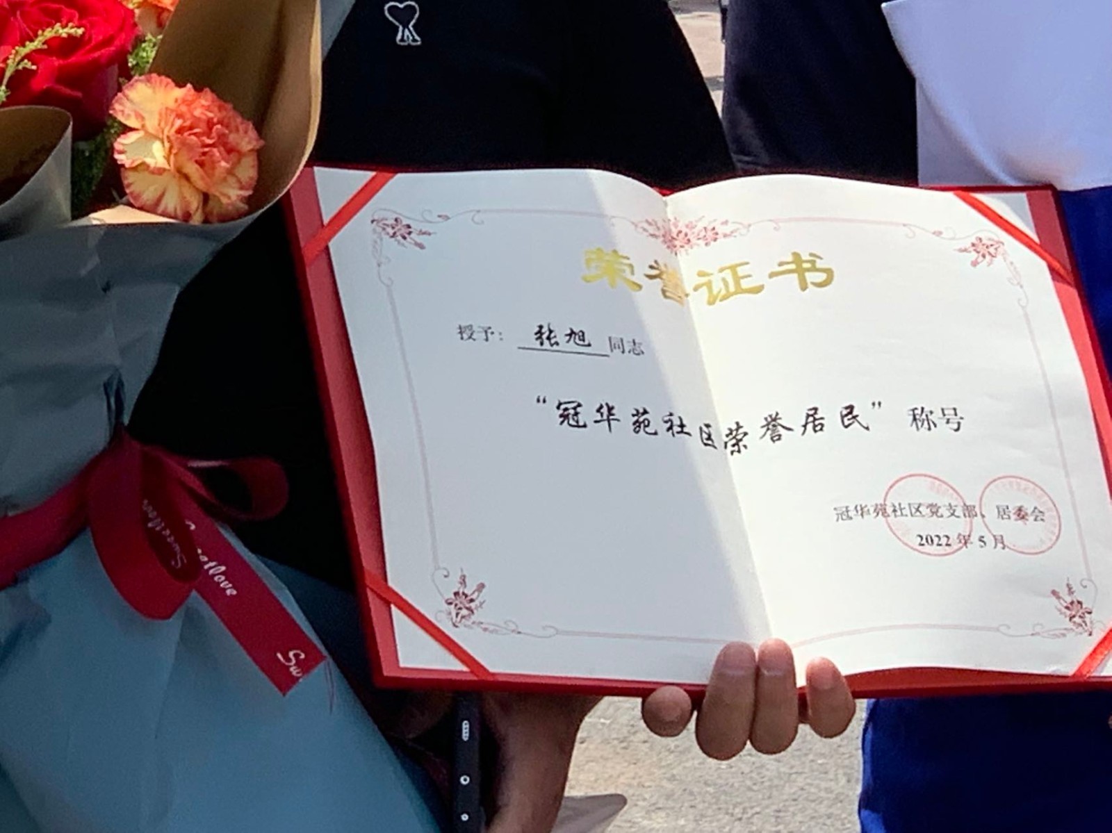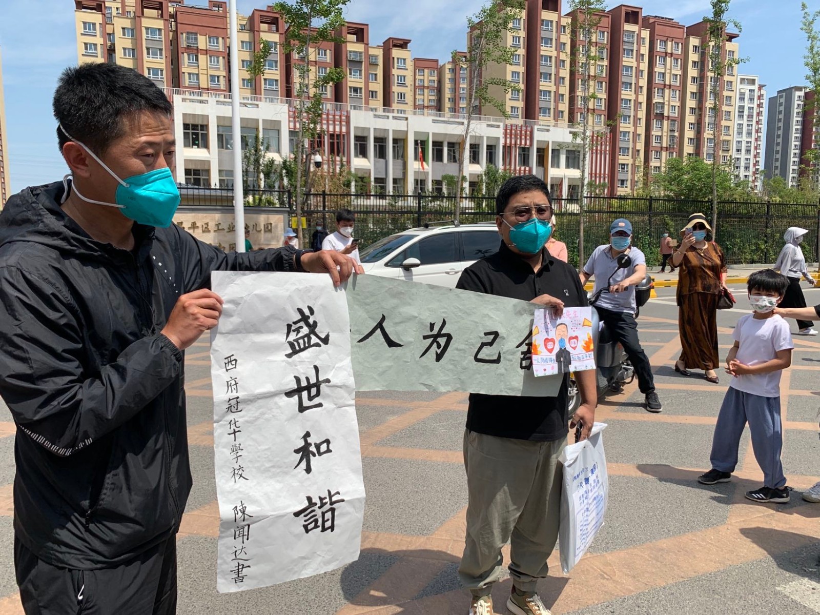 社区居民准备了横幅、鲜花和手工艺品,社区的小学生写了书法,还有以他的事迹为题材创作的简笔画。