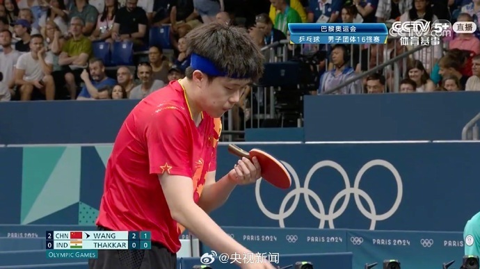 巴黎奥运乒乓球男子团体16强赛,由樊振东、马龙、王楚钦、梁靖崑 (P卡:替补队员)组成的中国队战胜印度队,顺利晋级8强。