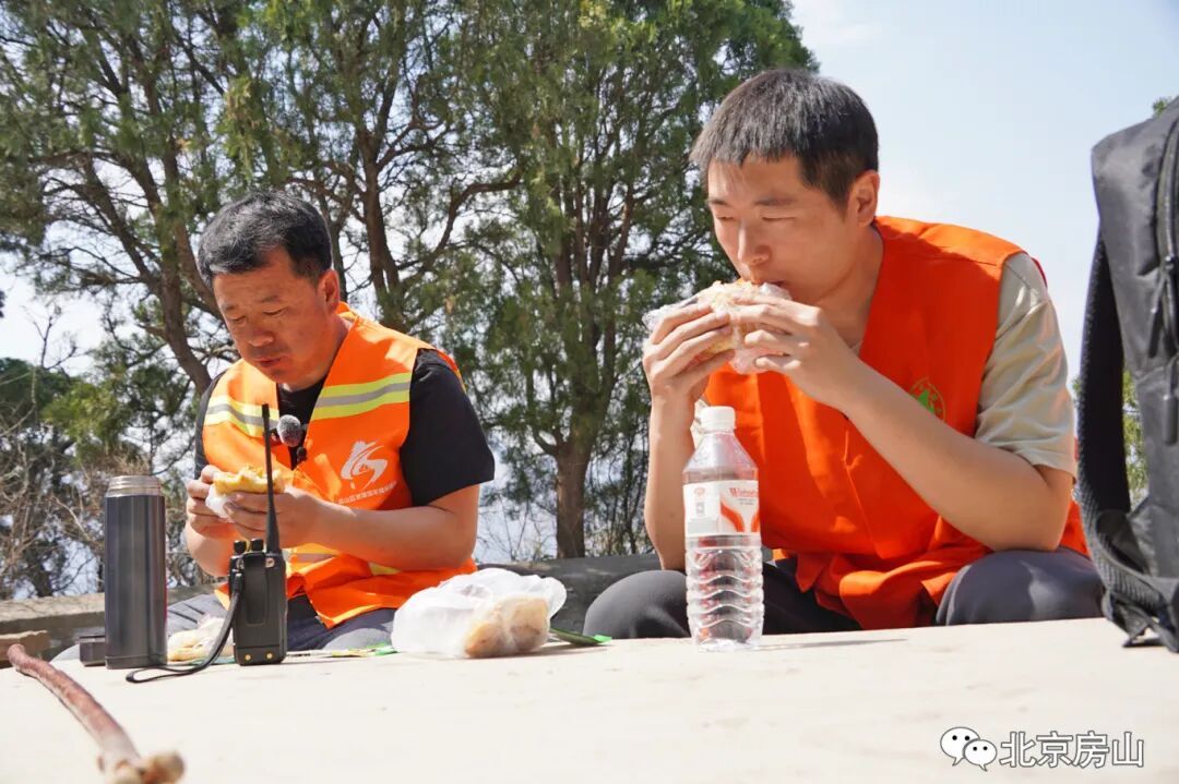 尚海忠卸下背包,从里面拿出干粮和水。他的包里还装着望远镜、手台、水壶。他和同事的午餐很简单,是几个烧饼夹鸡蛋和烧饼夹肠,还有一小袋榨菜。“来,吃饭,”他把东西摊在石桌上,邀请我们一起吃,“巡山基本就这样,带上中午的饭,走到哪儿吃到哪儿。”