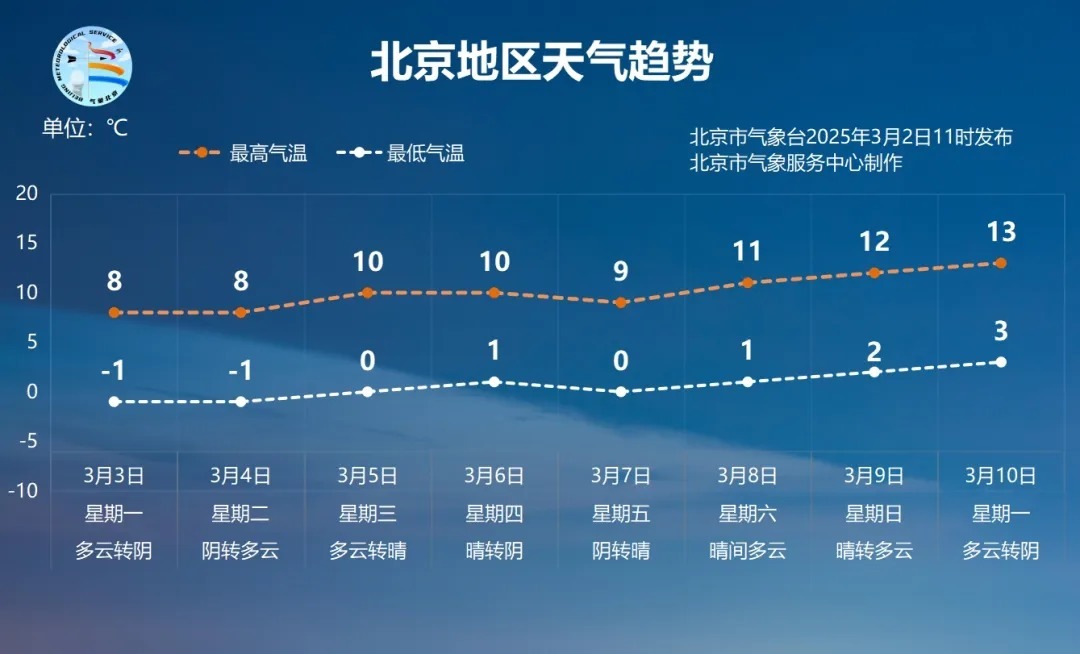 新的一周开始了,京城气温将缓步回升,春天的脚步越来越近啦。预计3月3日至3月10日,白天最高气温8~13℃,夜间最低气温-1~3℃。