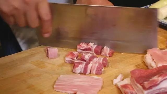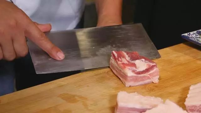 去皮小窍门:五花肉从中间下刀切至肉皮,接着沿着案板平行片下肉块。