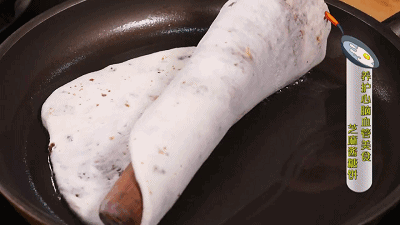 煎制:锅中倒入少许油,让裹好的豆皮均匀的蘸上糊,放入锅中小火煎制。煎制一面焦黄翻面,煎制过程要不停晃动锅使其受热均匀。