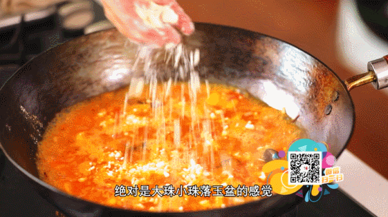 甩果:将调好的鸡蛋液倒入勺子中,直接甩到锅里形成大片蛋花,关火加盖焖30秒即可。