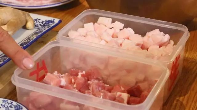 将分好的瘦肉和肥肉切成小肉丁备用(注意:不要切太小,防止炸干)。