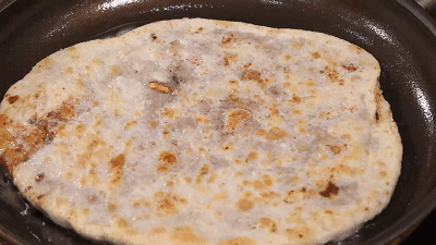 1是双面焦黄,2是面饼中间一鼓起,就证明饼已经烙至成熟了。