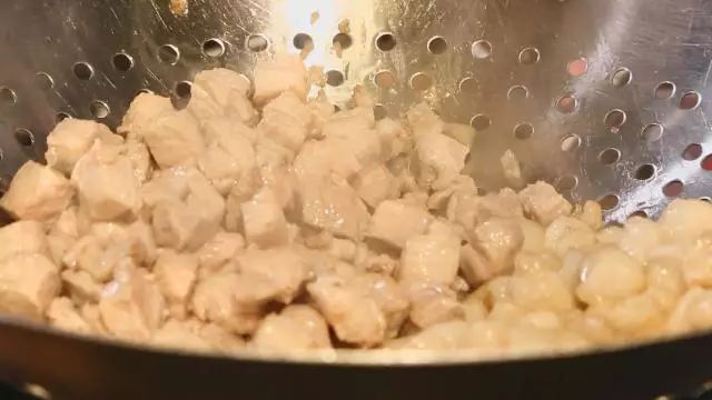 炸制食材:开火,油锅烧至7成热下入肥瘦肉丁滑熟捞出备用。(先肥肉后瘦肉,先把肥油炸出一半肥油,后下入半斤瘦肉,滑熟了就可以)