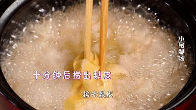 撇除浮沫,煲煮10分钟后,捡出梨皮。