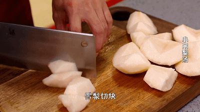 食材处理:雪梨洗净去皮(梨皮切长条,后期可用),切成小块。