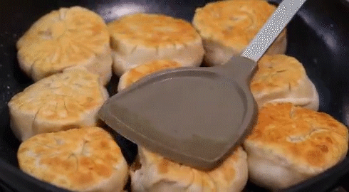 烙饼:锅中少许油,封口面朝下,码的时候让饼挨上容易出现饼的厚度。饼翻面后焖一会,用铲子压一压饼让汤汁溢出一些。