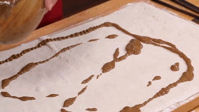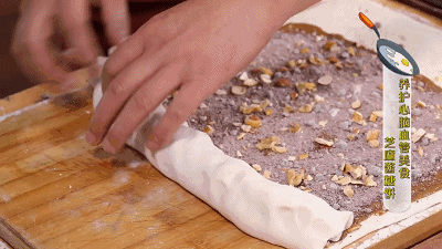 制作:将芝麻酱、红糖一层一层均匀地涂抹在面皮上。最后再撒上一层杏仁、核桃、腰果碎即可。
