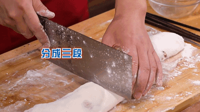 面饼从一侧卷起,现成圆柱形用面皮封口粘住。改刀切成10cm左右的剂子,将两头切面封住,稍加醒制。