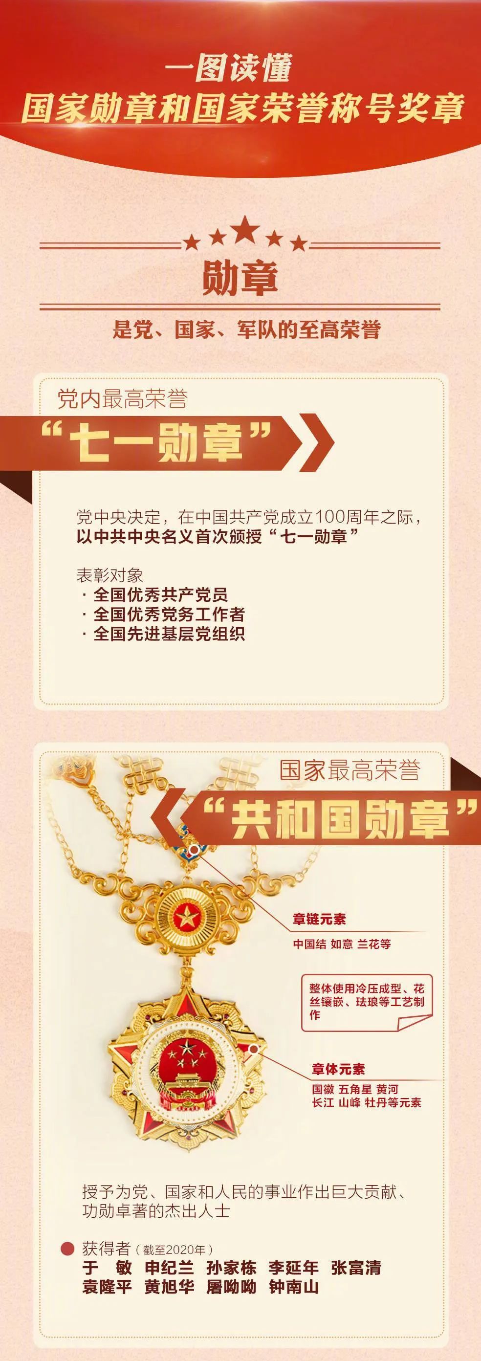 党中央决定,在建党百年之际,以中共中央名义首次颁授“七一勋章”。我国最高荣誉体系中的“五章”包含已颁授过的“共和国勋章”、“八一勋章”、“友谊勋章”和国家荣誉称号,加上今年的“七一勋章”,我国五大最高荣誉年内颁齐。