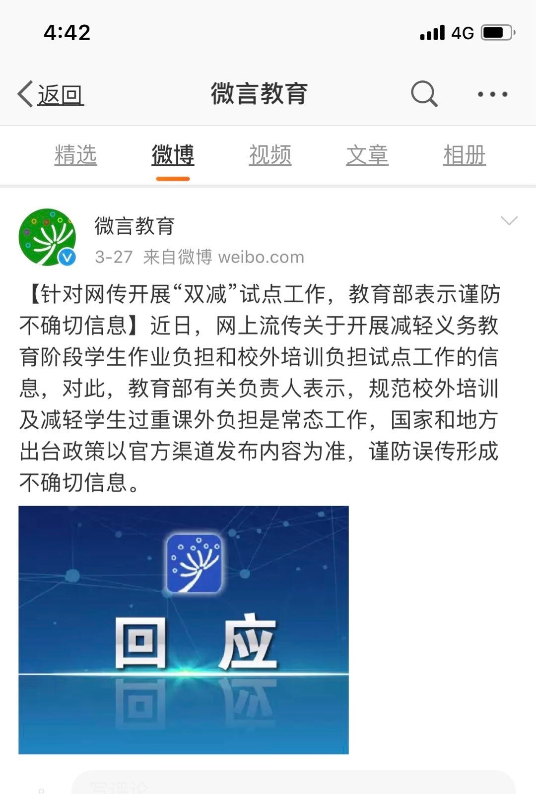 对此,教育部3月28日通过官微表态:“近日,网上流传关于开展减轻义务教育阶段学生作业负担和校外培训负担试点工作的信息,对此,教育部有关负责人表示,规范校外培训及减轻学生过重课外负担是常态工作,国家和地方出台政策以官方渠道发布内容为准,谨防误传形成不确切信息。”