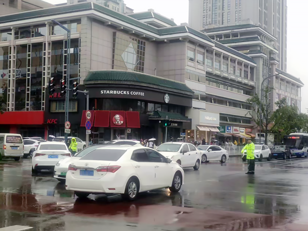 交警在雨中执勤,疏导过往车辆。