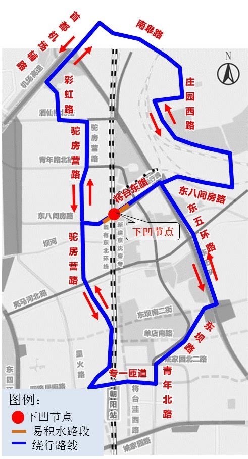 将台东路下凹式立交节点疏导路线:向北绕行首都机场辅路或者向南绕行朝阳站高架匝道