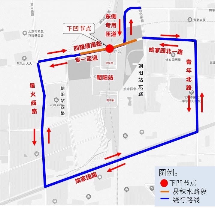 四路居南路下凹式立交节点疏导路线:可走高架匝道或向南走姚家园路酒仙桥北路下凹式立交节点疏导路线:可向北绕行至首都机场高速公路辅路方向将台东路下凹式立交节点疏导路线:向北绕行首都机场辅路或者向南绕行朝阳站高架匝道东五环西辅路下凹式立交节...