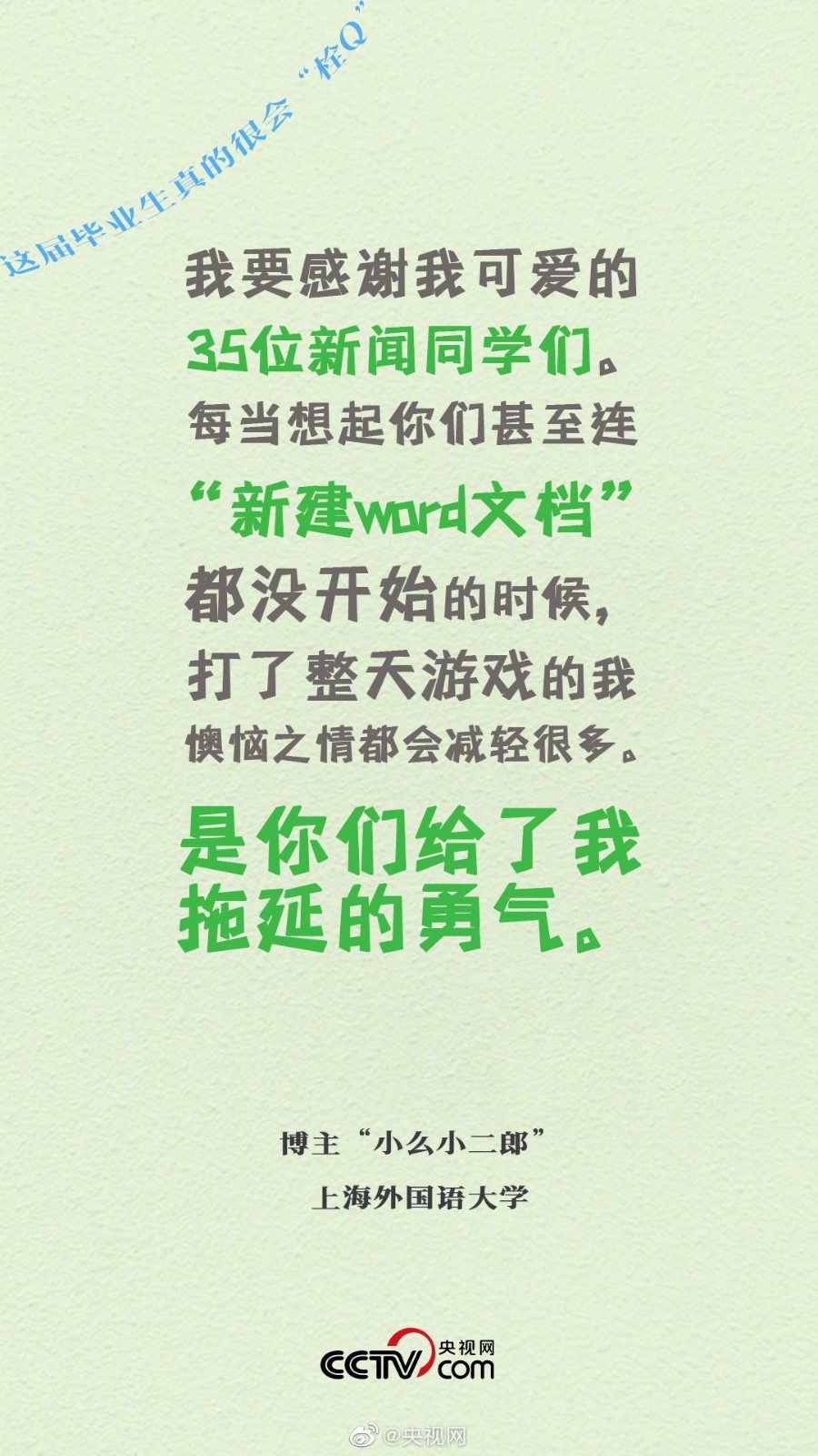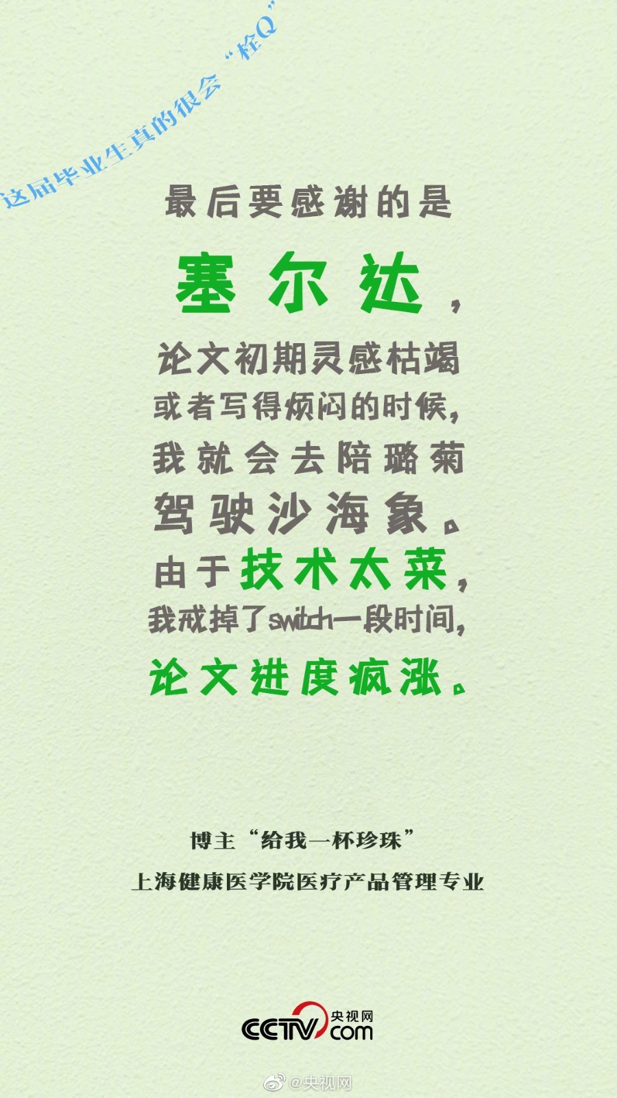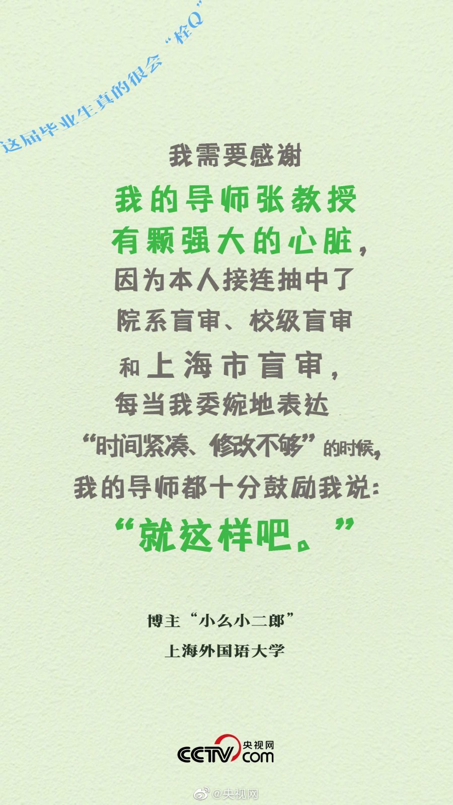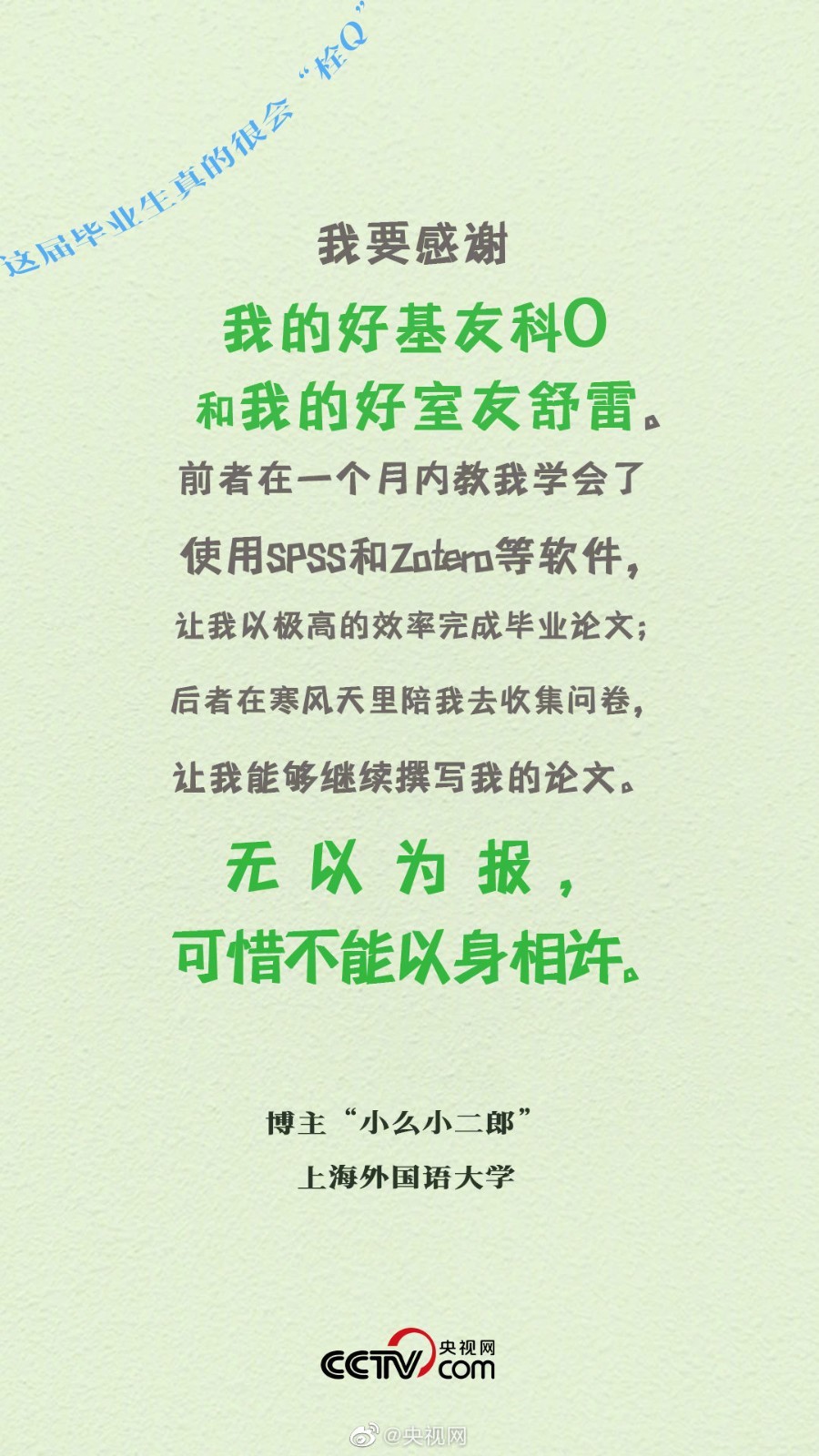 你完全想不到什么会出现在这届毕业生的论文致谢里:螺蛳粉、东北菜、水果捞……即使是猜出了致谢中的“常驻嘉宾”导师、同学,可能也猜不到被感谢的是导师的“强大心脏”、同学们给的“拖延勇气”。有趣、真诚、个性、多元,这就是年轻的模样!