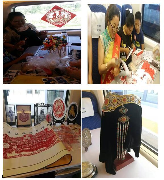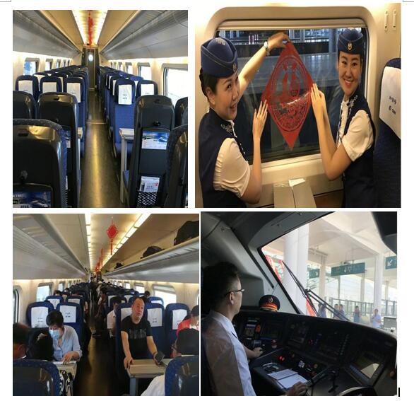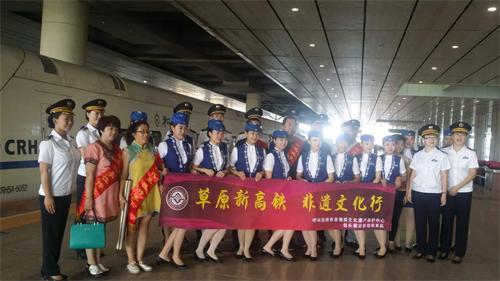 飞驰的动车组,也是欢乐的海洋。来自呼张铁路公司和各参建单位的铁路建设者,早已无法按耐心中的自豪与喜悦;蒙古皮画、蒙镶银工艺制作、和林剪纸艺术等内蒙古本土非物质文化遗产传承人也登上高铁,现场制作工艺品;由铁路职工组建的草原铁路“乌兰牧琦”在列车上载歌载舞,一曲曲欢快的民族歌舞引得观众掌声连连;来自铁路一线的草根书画家也在高铁车厢里挥毫泼墨,为首航体验的旅客送去文化大礼;而那一幅幅壮美的草原风景,更是淋漓尽致地展现着内蒙古的柔情和神秘,让心中激荡起坐着火车看草原的豪情!首趟列车上,铁路部门精心组织的草原歌舞表演、非遗文化展示、铁路旅游推介、现场书画创作四个主题的活动,让旅途中飘荡着欢乐的笑语和优美的旋律。
