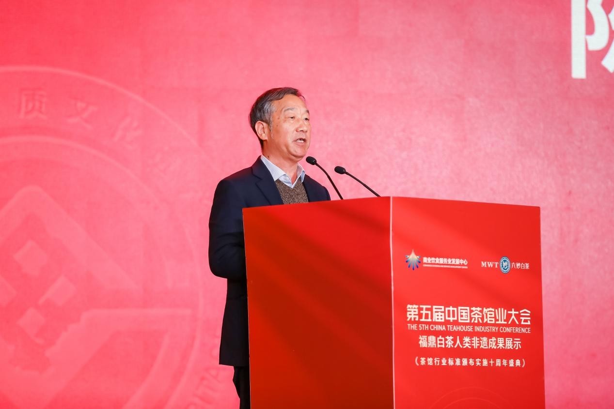 活动伊始,商业饮食服务业发展中心主任张艳彬,中国商业联合会会长姜明,国家市场监督管理总局发展研究中心副主任冯军,福鼎市人大常委会原主任、市茶业协会党支部书记、宁德“弱鸟先飞滴水穿石”30年突出贡献人物陈兴华相继发表致辞,分享了对茶馆行业发展的独到见解以及对福鼎白茶非遗制作技艺传承发展的建议。