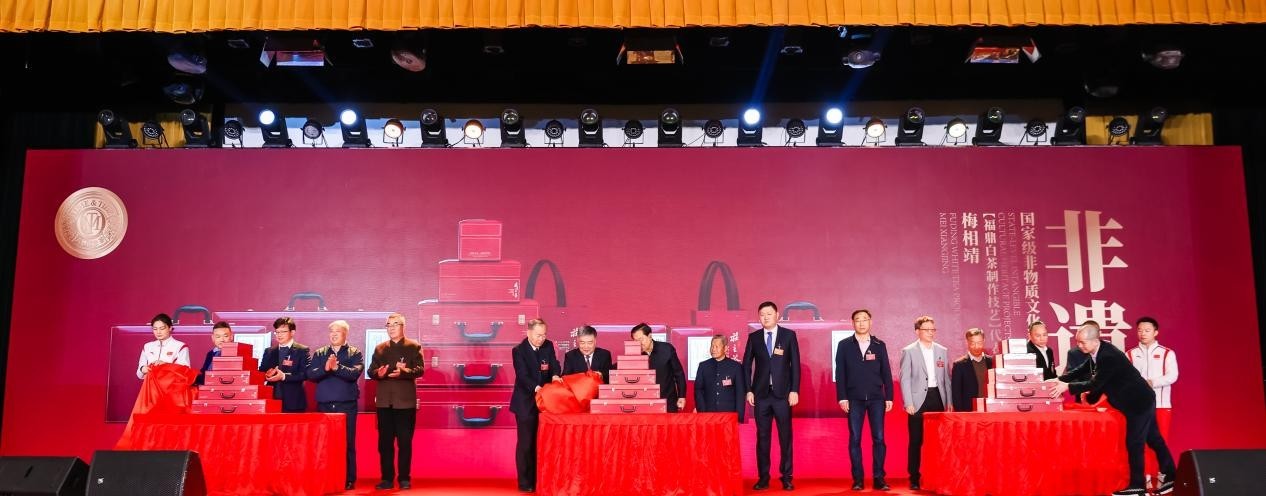 本次活动既是齐聚茶界精英的行业盛典,又是一场共享非遗国茶的品鉴大会。百年来,以福鼎白茶为代表的中国茶不断向世界输出展示东方茶文化的魅力。为纪念庆祝福鼎白茶的荣耀时刻和茶馆业的卓越发展,六妙股份携手梅相靖大师推出了“1915巴拿马万国博览会金奖110周年纪念非遗茶”及“茶馆行业标准颁布实施十周年纪念茶等系列非遗茶”。活动现场,与会领导嘉宾来到台前一同为“福鼎白茶人类非遗成果展示暨非遗茶发布”进行了揭幕,共同开启了福鼎白茶守正创新发展的新华章。