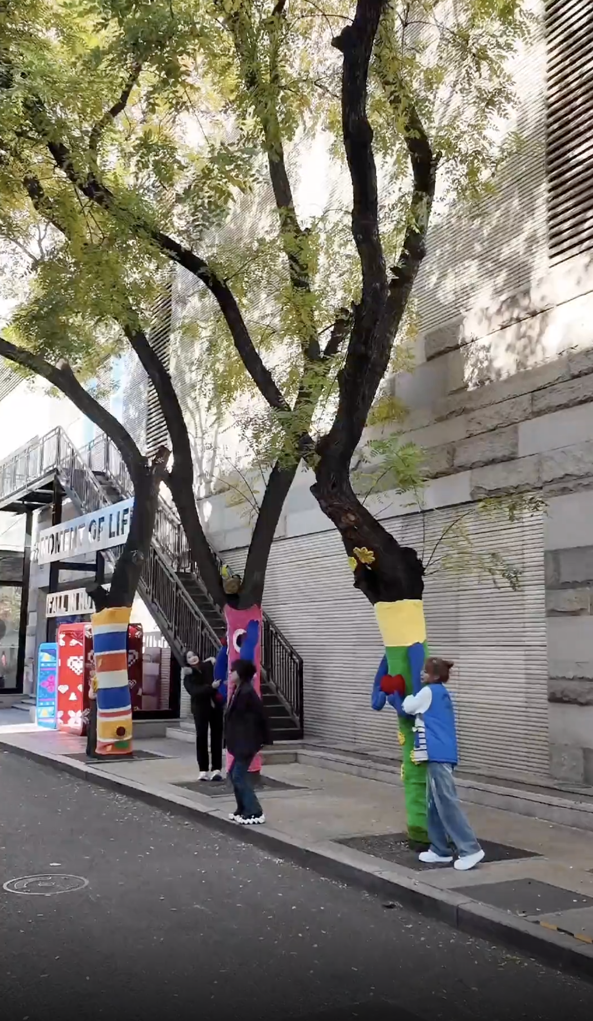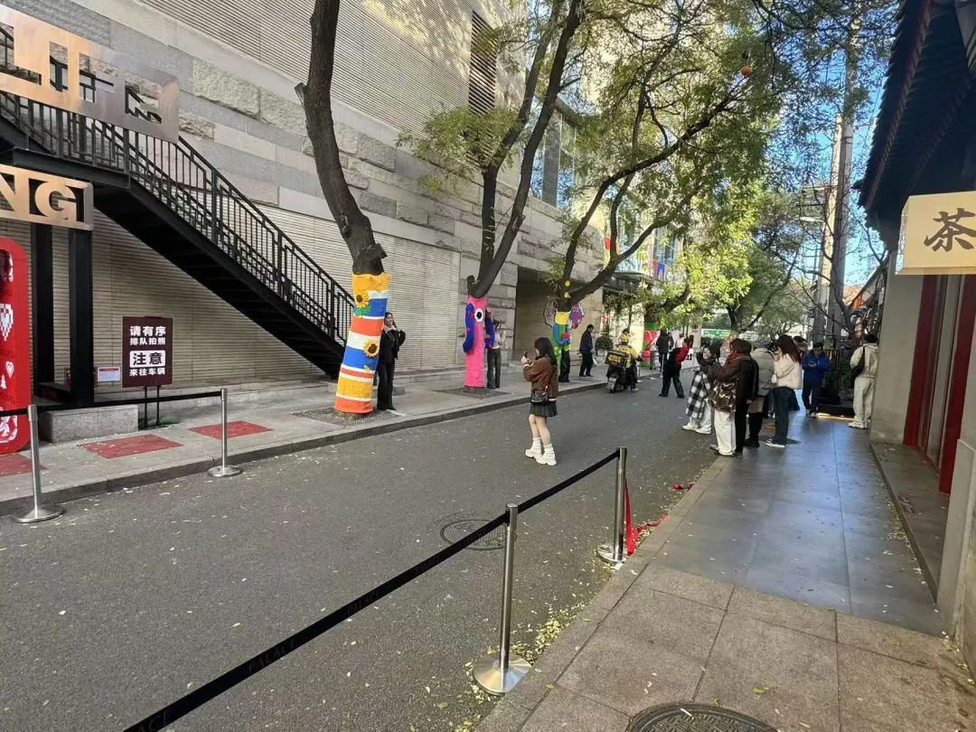 “这些‘毛衣’是由我们提供设计,由第三方公司进行制作的。每棵树上的‘毛衣’需手工编织一周时间,五棵树共用了约200斤毛线。今天打卡的人还比较少,周末每棵树都得排半个小时才能拍上照。”一位物业工作人员表示,相较去年第一次布置“毛衣树”,今年增添了毛线的配色,体现出了层次,并有意识地做出了手臂等互动设计。“为了争取营造良好交通秩序,今年我们还增设了工作人员,在现场对堵路等行为进行劝阻。”工作人员说,他们在胡同南北两侧增设了约十余米的警戒线,并动态调整保安力量,“最多时要增派10名工作人员到现场维持秩序。”