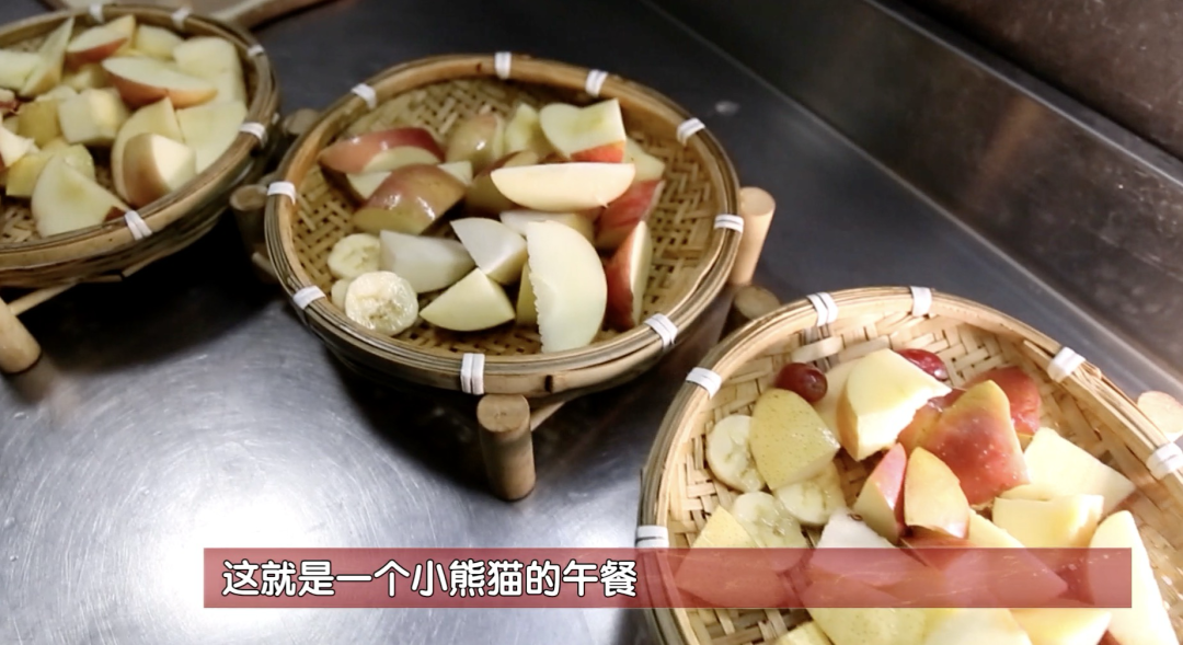 李阔说:“给它两个小葡萄,一个小苹果,梨就切一点点,因为它不是很爱吃,香蕉切三片就行,这就是一只小熊猫的午餐。小熊猫95%的能量都靠竹叶来摄取,其他5%来自肉类、蛋类和水果类,甜甜的水果肯定是小熊猫的最爱,但是不能过多摄入,它们摄入过多糖分之后可能会得‘三高’和糖尿病,最严重的情况下,还有可能减少3到5年的寿命。”