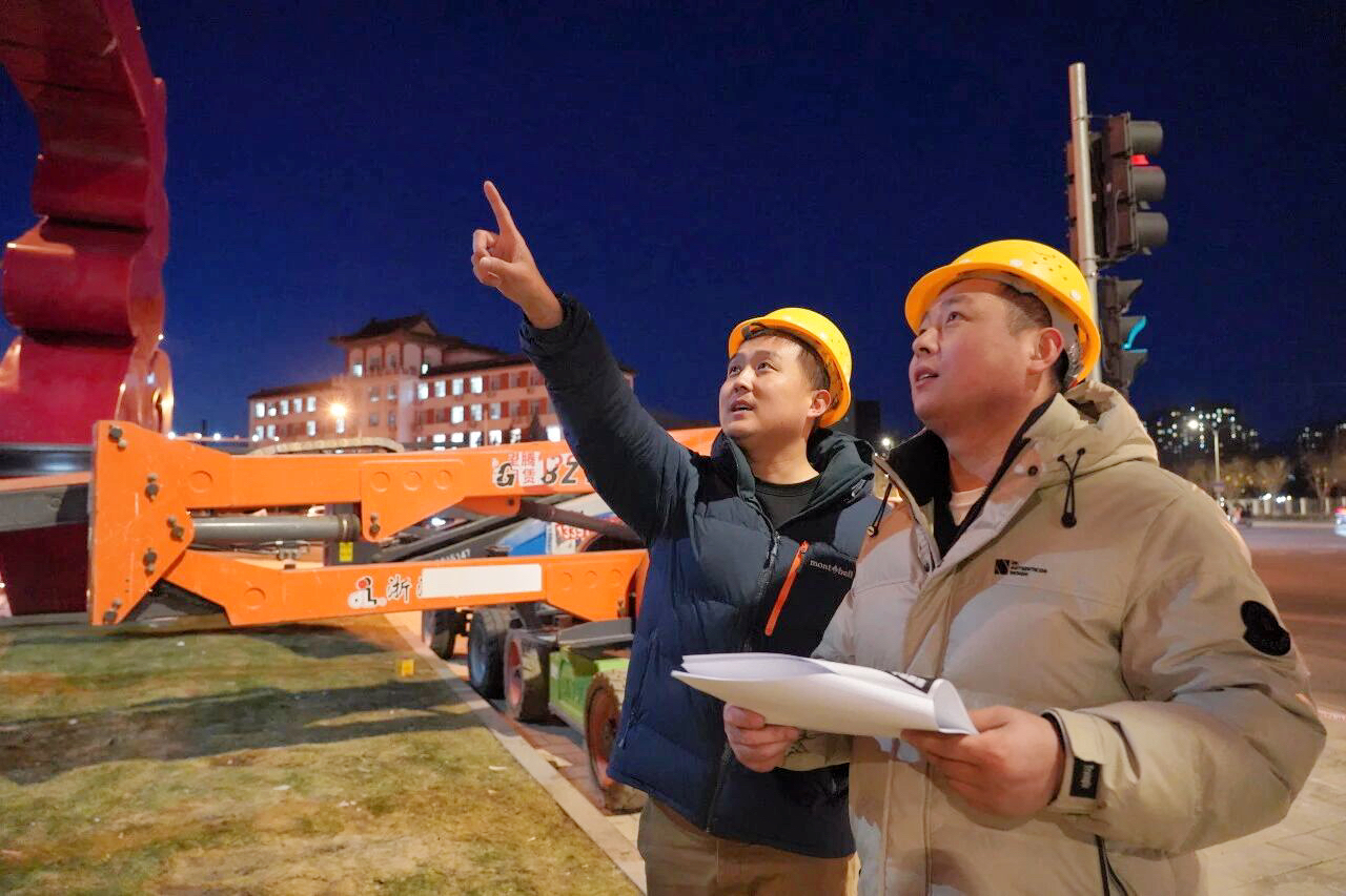 “白天道路人流车流量大,施工影响交通,只能晚上干。”寒风中,梁涛声音有些颤抖。远处,施工人员正借助高空作业车,调整着主题景观“马跃新程-幸福之门”的最后一道轮廓。